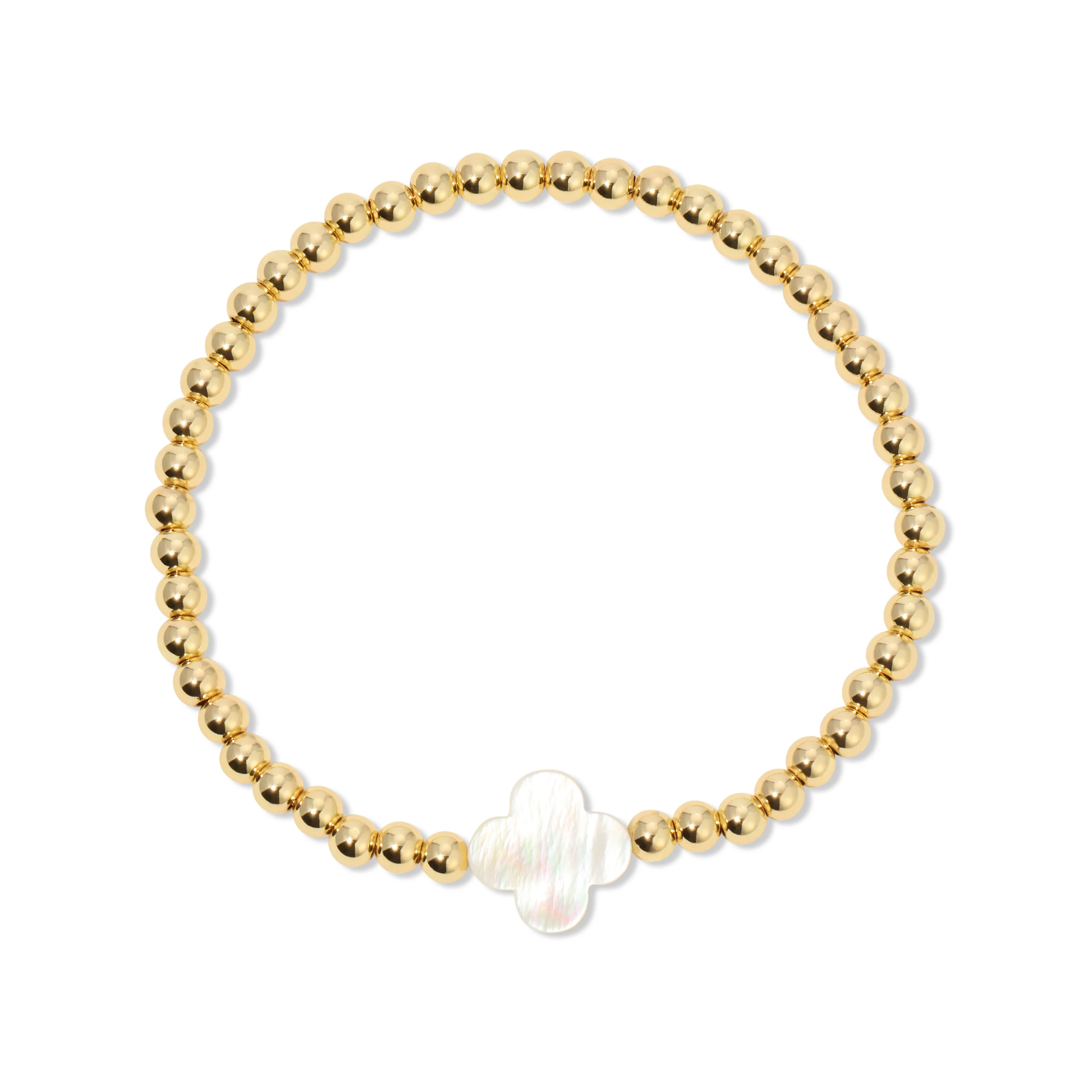 Elevate your everyday stack with a touch of coastal luxury. This 18k gold plated beaded bracelet features genuine quatrefoil shell charms—bringing together natural beauty and refined design. The real shell adds an organic, one-of-a-kind element, while the gold plating gives it a luxurious glow. With its perfect balance of playful and polished, this bracelet is a go-to accessory for everything from beachside brunches to evening soirées. Whether worn solo for a hint of elegance or layered with other textures and tones, it effortlessly enhances any bracelet stack!