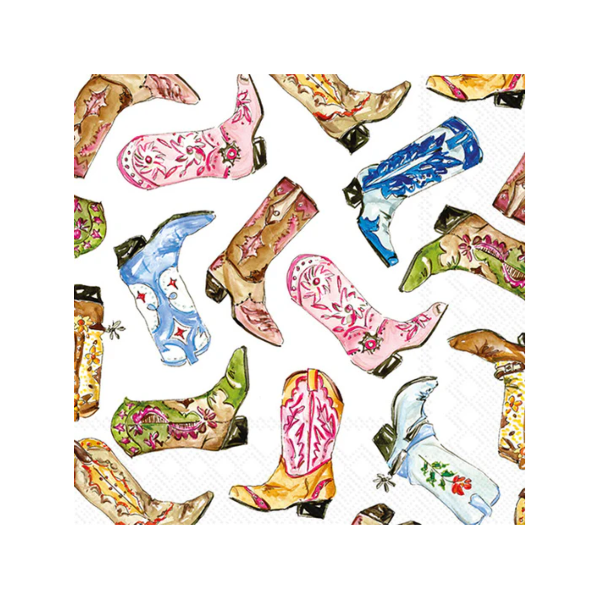Add a splash of Western spirit to your gatherings with Boot Scootin Cocktail Napkins. Vibrant watercolor cowboy boots in bold, cheerful colors dance across premium soft white paper, bringing instant personality to cocktail hour, backyard barbecues, or festive celebrations. Crafted from quality 3-ply German-printed paper, these napkins are as durable as they are delightful. At 5 x 5 inches, they're the perfect size for any occasion. Whether you're hosting a casual porch party or a lively event, these charming napkins deliver authentic Western flair with every use—proof that practical doesn't have to mean plain.