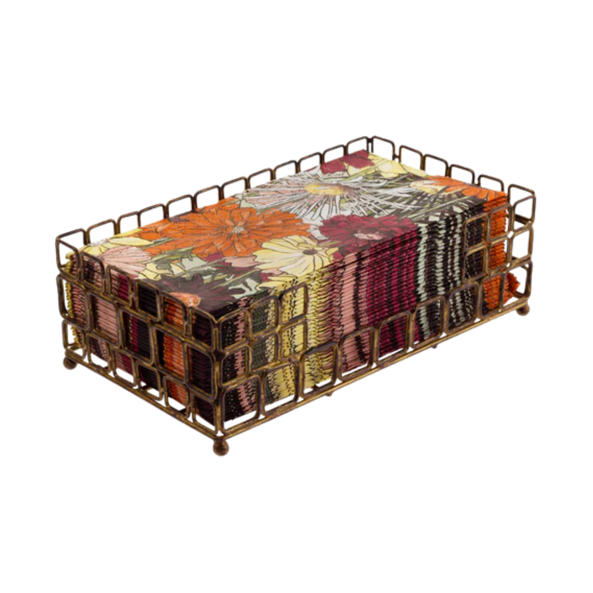 This elegant Guest Caddy transforms practical storage into a statement piece. Forged from iron with a warm aged gold finish, its sophisticated lattice pattern adds refined style to any room—from the bathroom vanity to the dining buffet. The sturdy open-grid construction keeps guest towels, napkins, or essentials organized and accessible, while decorative ball feet elevate it above ordinary organizers. Measuring 8.75 x 5 x 3 inches, it's the perfect size for everyday use without overwhelming your space. A timeless accent that marries function with understated luxury. No napkins included.