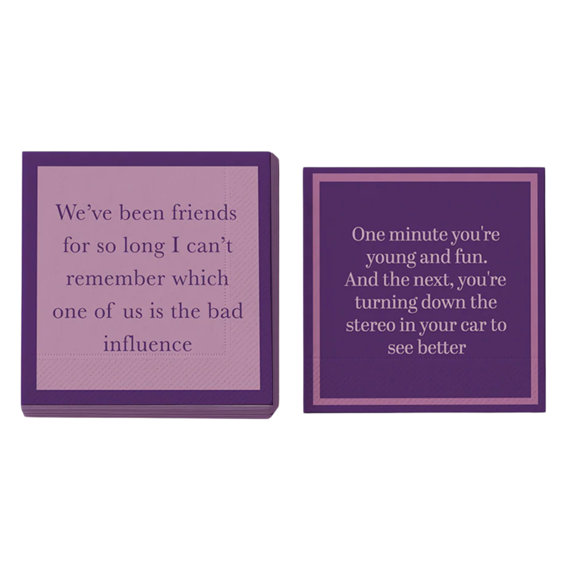 The Original Double Sided cocktail napkin has laugh out load, hilarious statements on both sides of the napkin with a fun contemporary design on the inside. Package includes (20) 3 ply cocktail napkins 5"x5"