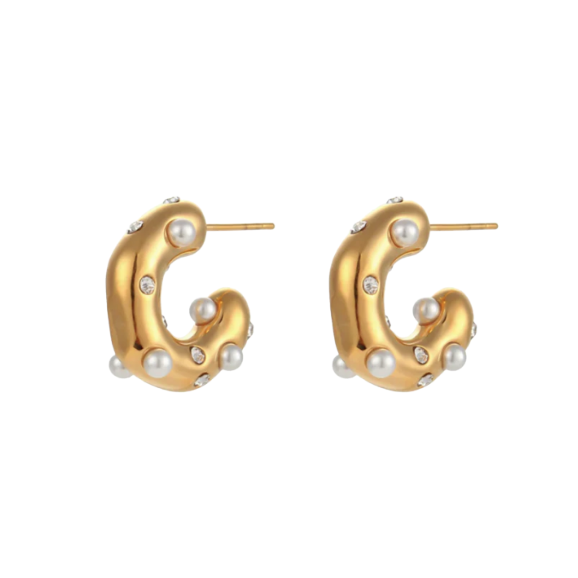 Elevate your everyday with Dallas Hoops, chunky yellow gold hoops adorned with delicate pearl accents. These 18k gold-plated stainless steel earrings blend boldness with refinement, offering substantial presence softened by lustrous pearls. The hypoallergenic stainless steel base guarantees comfort for all-day wear, while premium gold plating preserves its warm, radiant glow. The interplay between chunky metalwork and subtle pearl details creates visual interest that works beautifully solo or layered with other pieces. A sophisticated statement that celebrates both confidence and grace.