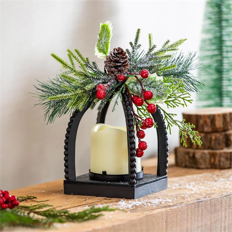 Illuminate your home with the Lantern Woodland, a charming metal lantern featuring a battery-powered LED candle at its center. Adorned with natural greenery and pinecones on top, it brings a cozy, seasonal touch perfect for holiday decorating. This elegant piece effortlessly combines rustic beauty with safe, flameless lighting, creating a warm ambiance in any room. Ideal for adding festive spirit without the worry of real flames, this lantern makes a thoughtful accent for your home or a delightful gift.