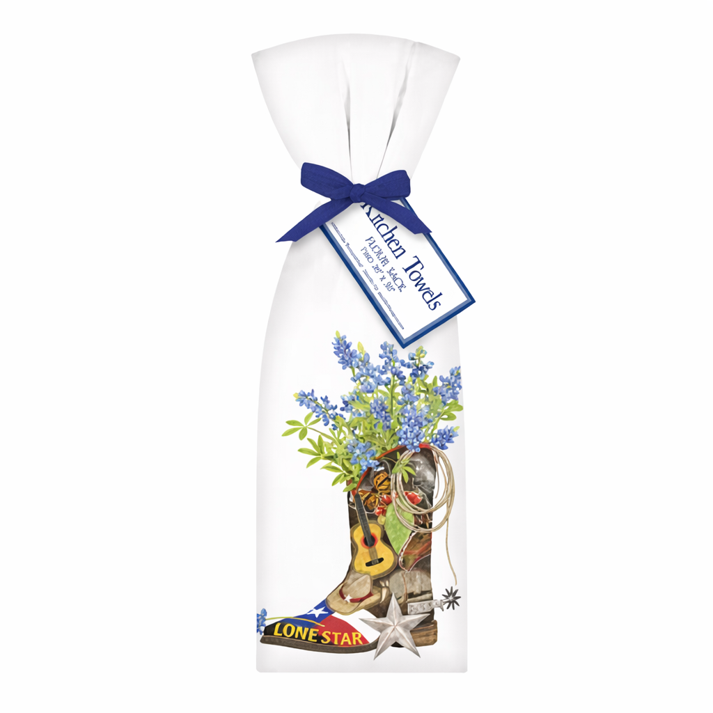 Discover the artistry of Mary Lake-Thompson Ltd with this charming Lone Star Boot Tea Towel set. Each pair features whimsical, hand-drawn designs printed on premium 100% cotton flour sack towels (30"x30"), thoughtfully hand-folded and tied with a coordinating bow. Designed, packaged, and printed in the USA on towels crafted in India, these kitchen essentials bring both function and character to your home. Machine wash cold on gentle cycle with mild detergent—no bleach. Air dry or tumble dry without heat, and iron from the reverse side only to preserve the beautiful artwork.