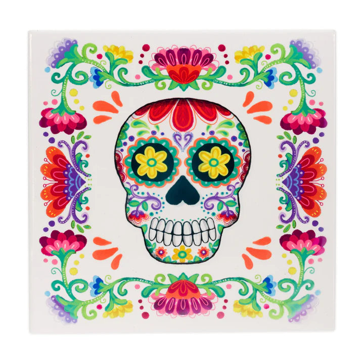 Bring the lively energy of the Day of the Dead into your home with the No Vida Cantina White Trivet. Featuring an intricate design of a vibrant sugar skull surrounded by colorful floral patterns, this trivet adds a festive and cultural touch to your kitchen or dining area while protecting your surfaces in style.