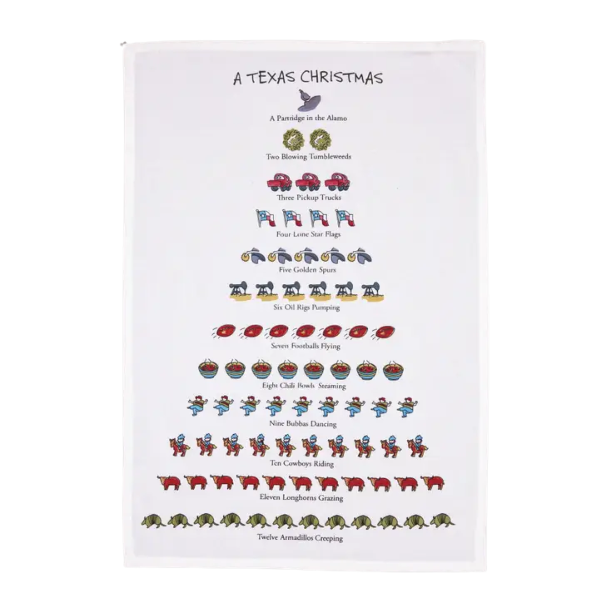 Add a festive touch to your kitchen with the Texas Christmas Towel, hand screen printed on soft cotton flour sack material. Designed by David Price, this charming tea towel celebrates the 12 Days of Christmas with a unique Texas twist. Perfect for holiday decorating or as a thoughtful gift, it brings warmth and spirit to any home during the season. Durable and stylish, it's a delightful way to brighten your space and embrace the holiday cheer.