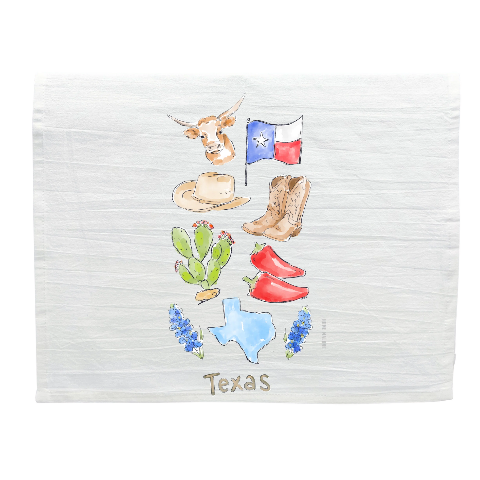 Add a little Lone Star flair to your kitchen with this Texas Icons Tea Towel, featuring a lively print of the state’s most iconic symbols. From cowboy boots and longhorns to bluebonnets, cacti, and the Texas flag, this towel celebrates everything big, bold, and uniquely Texan — all set against a clean white background.