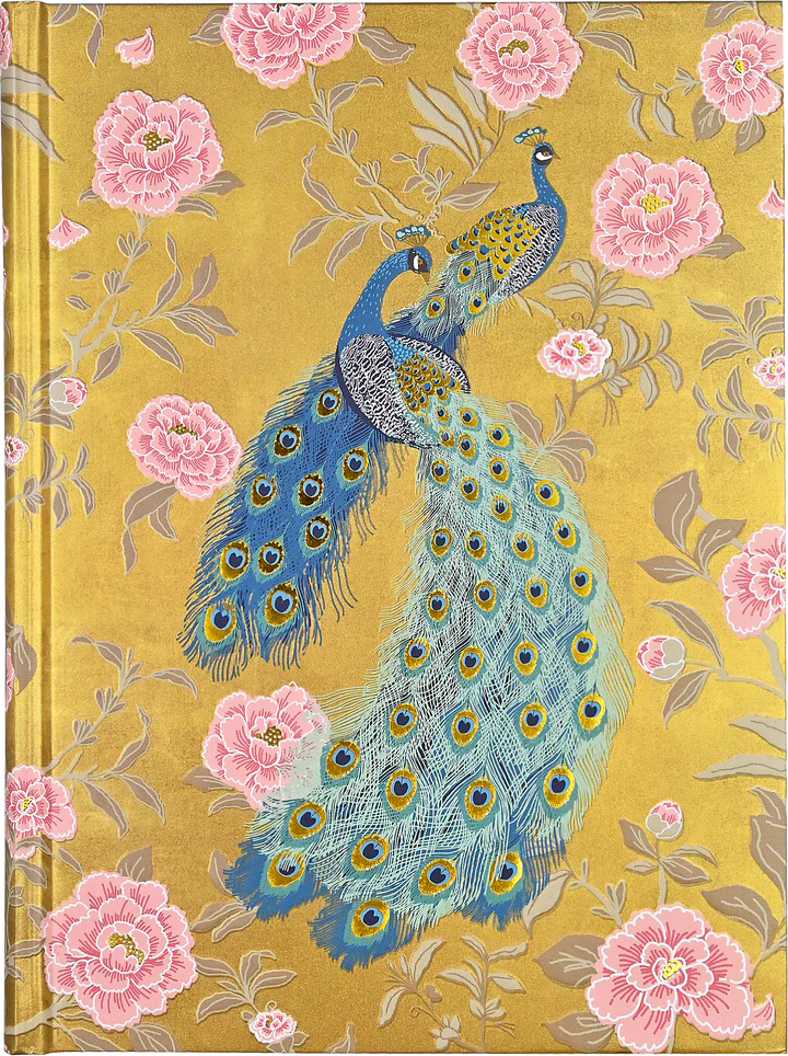 Victorian-inspired journal features a pair of regal peacocks and intricate florals against a golden backdrop.