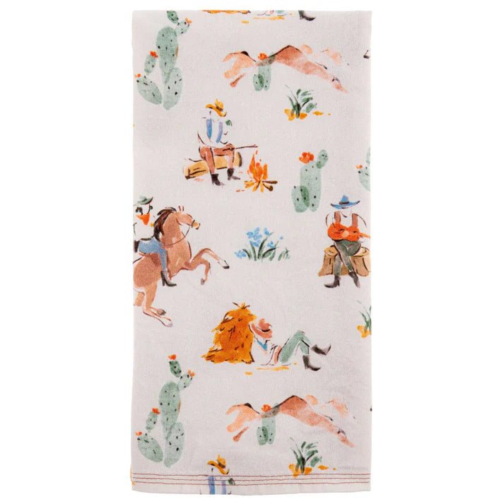 Our Vintage Cowboy tea towel will bring rustic charm to your kitchen with its intricate Western design. This kitchen essential is perfect for bringing a touch of vintage to your dining decor. Refresh your dining essentials with this piece of kitchen decor - perfect for adding a touch of sass to your kitchen! Details Vintage design Dimensions Approx. 28"L x 20"W Materials 100% cotton Care Tips Machine wash cold, tumble dry low